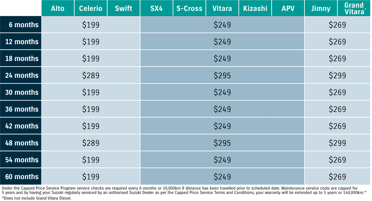 When you buy an eligible new Suzuki from 1 May 2013, you can have peace of mind knowing your Scheduled Maintenance Service costs are capped for 5 years. A wide range of Suzuki vehicles come with low capped price service costs for 5 years, so you’ll know up front the low price of one log book service to the next. It’s just one example of the advantages of Suzuki Capped Price Service.